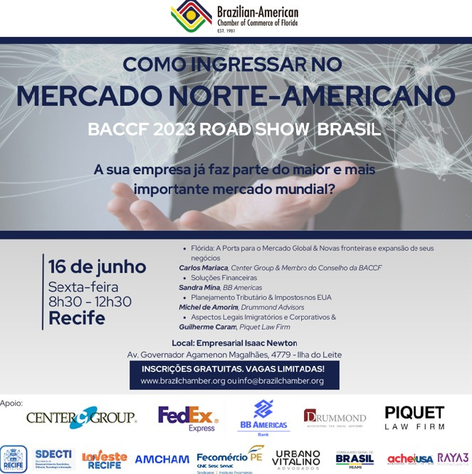 O Investe Recife é um dos apoiadores do 19º Road Show da Brazilian-American Chamber of Commerce of Florida (BACCF) que será realizado na capital pernambucana no dia 16 de junho, das 8h30 às 12h30.